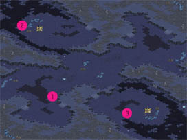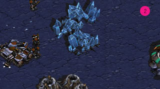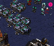 マップ左上がKwark−ttyo(以下Kwark) 右下がOjaru。双方ともTerranの戦いとなった。 序盤は小競り合いがほとんど無く、偵察のSCVをお互いMarinで牽制する程度だった。 Order的には、Kwarkがスタンダードな2Barrackからの進化を選択、対するOjaruは 1Barrack>Acadmy の進化重視。 戦局が変化したのは、お互いTankの生産および変形アップグレードが終わったあたり、 OjaruのねらいはDropでStarportの建設を急いだ結果、Tankの登場時刻は、ほぼ同時だった。 Kwarkは自陣右の丘上と中央にBunkerを作ったためか、MMの数がやや少なく、1Barrackの Ojaruと比べてやや多いといったところか。 (図@)