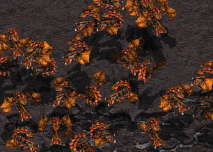 3.偵察による視界の広さ ZargはSupplyMaxを増やすためにOverLord(以下OL)を生産しますが、OLは生態AirUnitで あり、ノーマルの状態でクローク看破もできる優れたUnitです。移動速度はノーマルのままでは かなり遅い部類に入りますが、LairでUPすることもできて、輸送機にもなります。それがゲーム 開始から1匹いるのですから、序盤に対空攻撃力を持たないProtossやZargは本陣をそのまま 覗くことができます(Zarg同士はお互い覗きあうことになります)。しかもZarglingの数とコストを 生かした偵察やBurrowを絡めた重要地点の見張りなど、とにかく視界を広く取ることができ、 そのアドバンテージは大きなものです。Protossなどは序盤に奇襲を仕掛けること自体が 難しく、TerranはComsatがあるものの、重要地点の見張りはあまり得意ではありません。 Zargは終盤でもScourgeをつかった強行偵察やQueenのパラサイトなど、多彩な偵察手段 を持っていますので、偵察を行なうつもりであれば、いくらでも可能であるといっても良いでしょう。 ただし、弱点として、クロークを看破できるUnitがOLしかいないので、制空権を取られている とき、敵にクロークUnitがいるとOLを護衛しながらの行軍を強いられ、OLのSpeedがあがって ない場合などは、行軍そのものが難しくなってしまう場合があります。あらかじめ敵のオーダー を予想して、クロークの気配があるときはもちろん、その気が無いときでもOLのSpeedは 余裕があるうちにあげてしまうと良いでしょう。そうすることによりOLの生存率や偵察力自体が 向上し、場合によってはOLをつかっての強行偵察なども可能です。